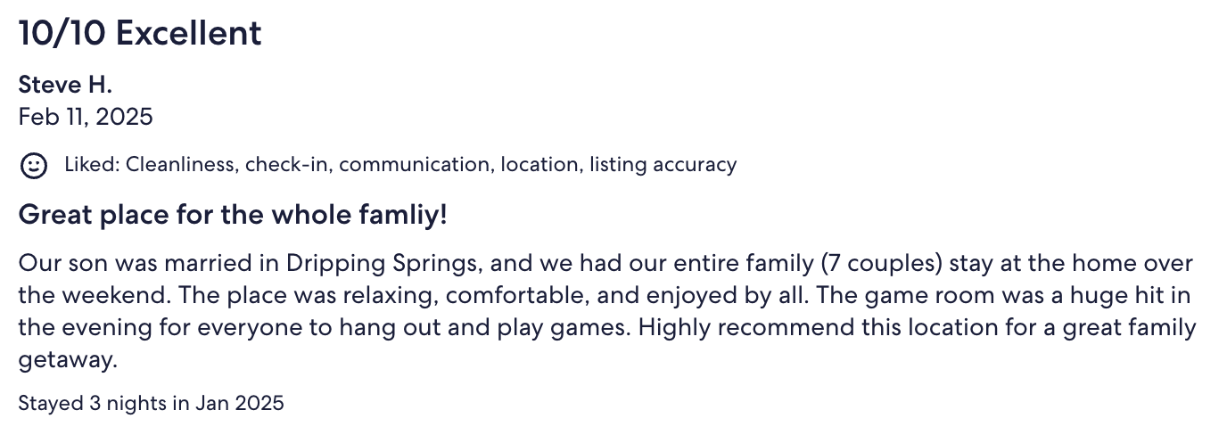 Exciting news! Our “Dripping Springs Social” has been named a 2025 VRBO Vacation Rental of the Year – one of just 10 winners in the U.S. out of over 2 million listings on the platform! This award highlights our dedication to providing outstanding service, world class amenities, and unforgettable experiences for our guests.